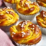 These vanilla-filled saffron buns are a delightful Swedish treat perfect for festive occasions or cozy coffee breaks. Soft, aromatic buns are infused with vibrant saffron and filled with a rich vanilla butter mixture, then baked to a golden perfection and topped with pearl sugar for an irresistible crunch.